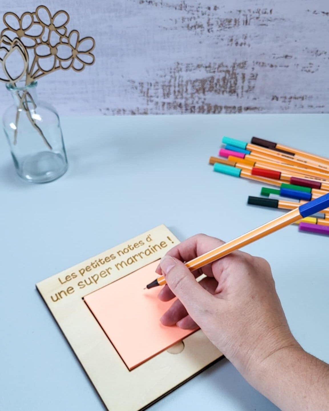 Ce joli cadre en bois gravé est prêt à recevoir vos mots doux, rappels importants ou dessins rigolos sur les post-it fournis. Une idée cadeau originale, utile et pleine de tendresse pour dire à Marraine combien elle compte.
