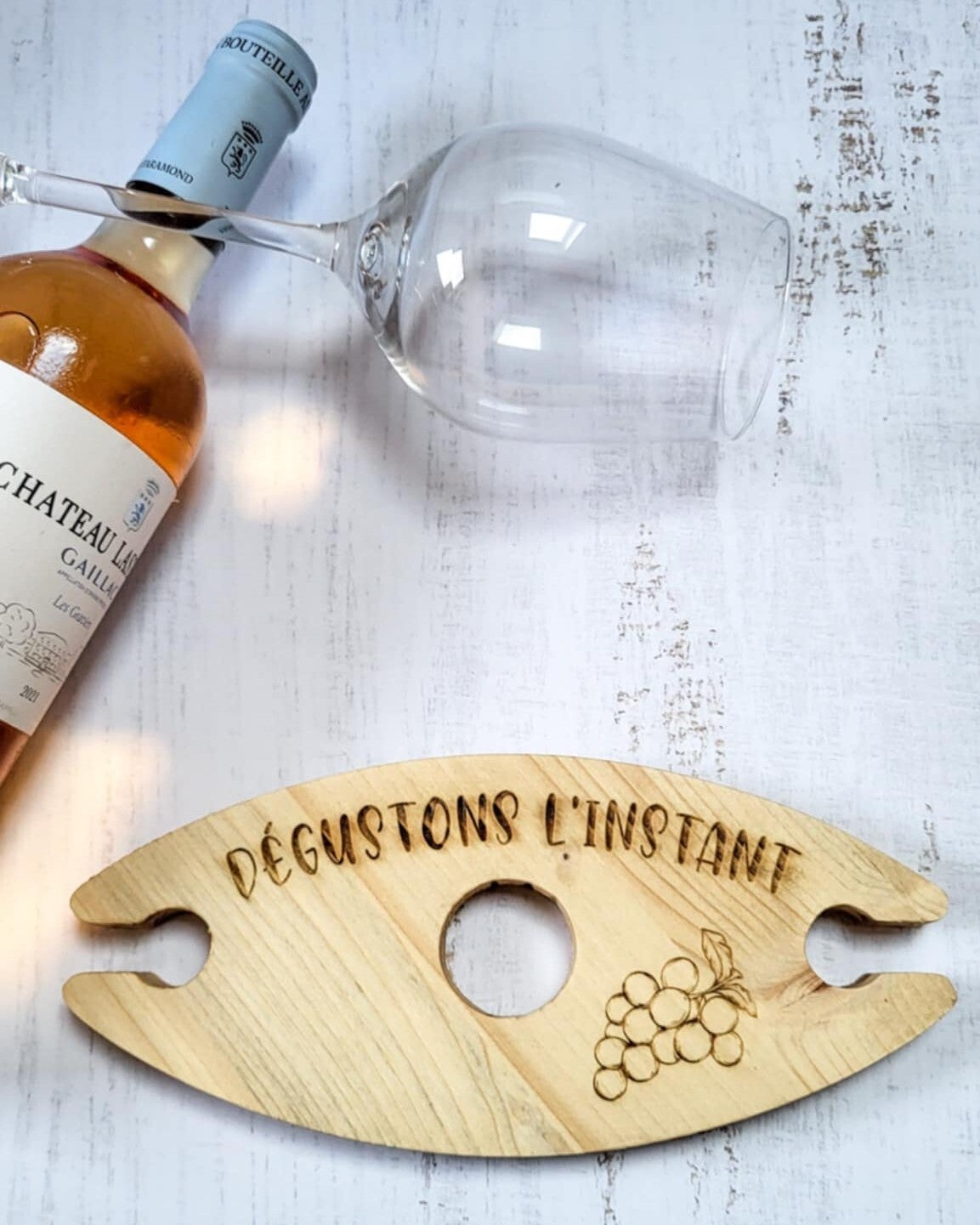 Ce support en bois naturel accueille deux verres à pied et s’installe directement sur le goulot d’une bouteille.