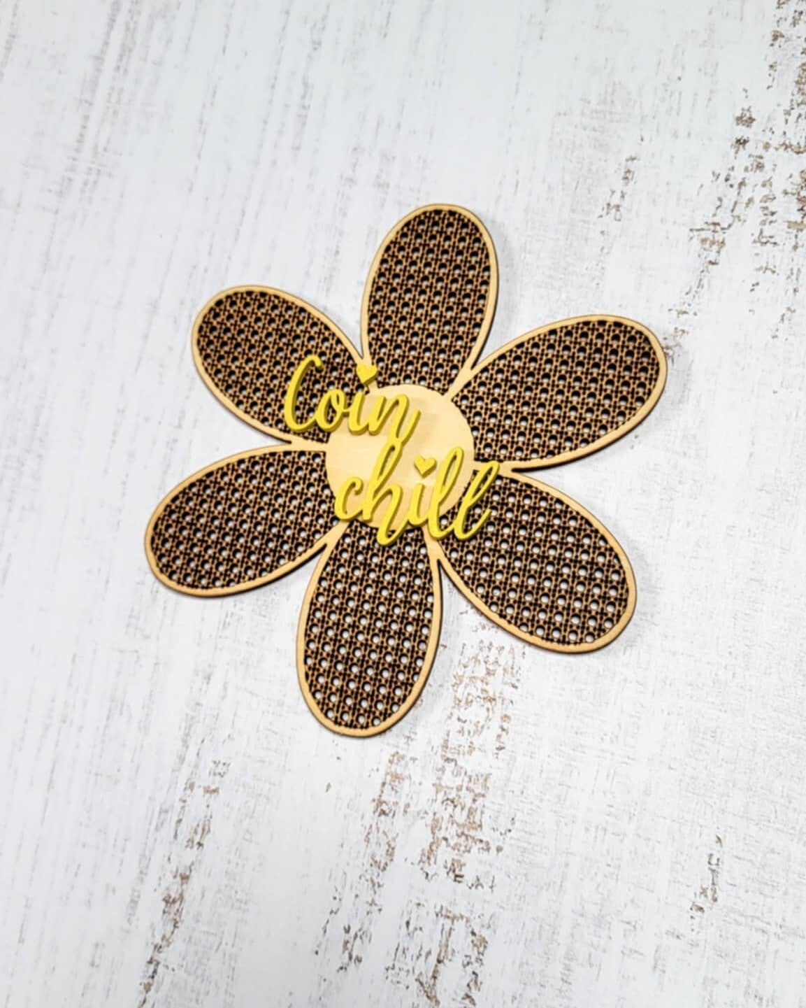 Une fleur en bois immitation rotin rehaussée d’un mot doux en bois peint par mes soins, pour une décoration encore plus unique.