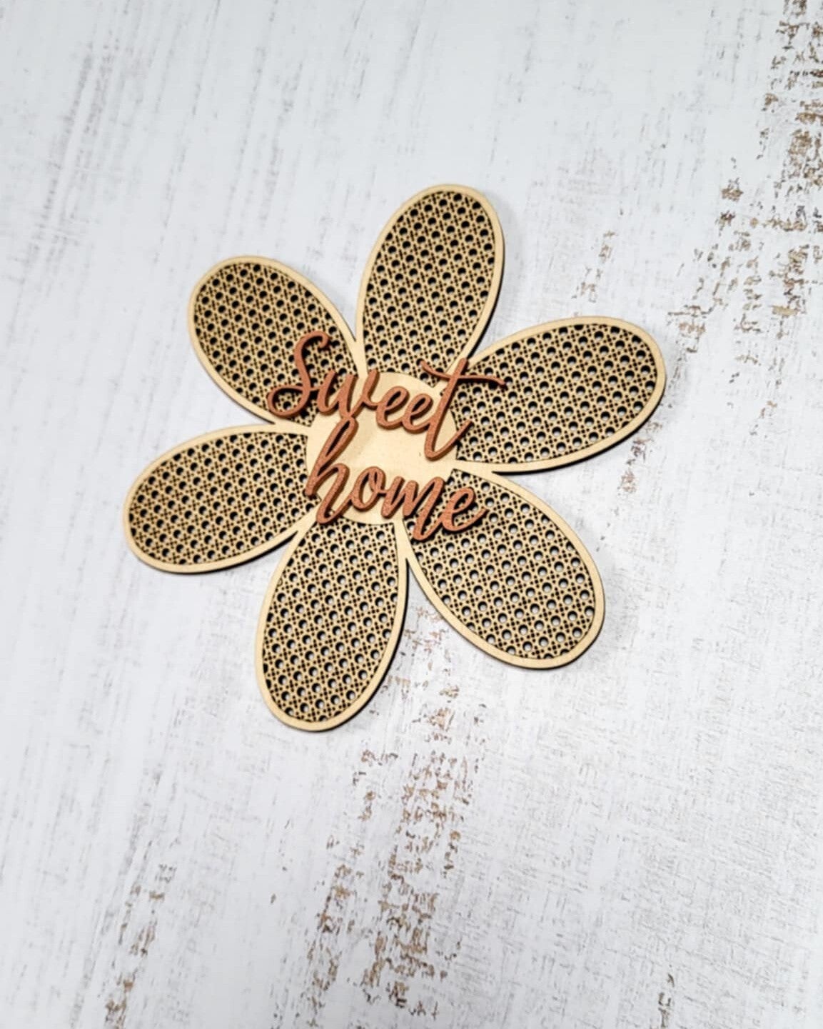 Une fleur en bois immitation rotin rehaussée d’un mot doux en bois peint par mes soins, pour une décoration encore plus unique.