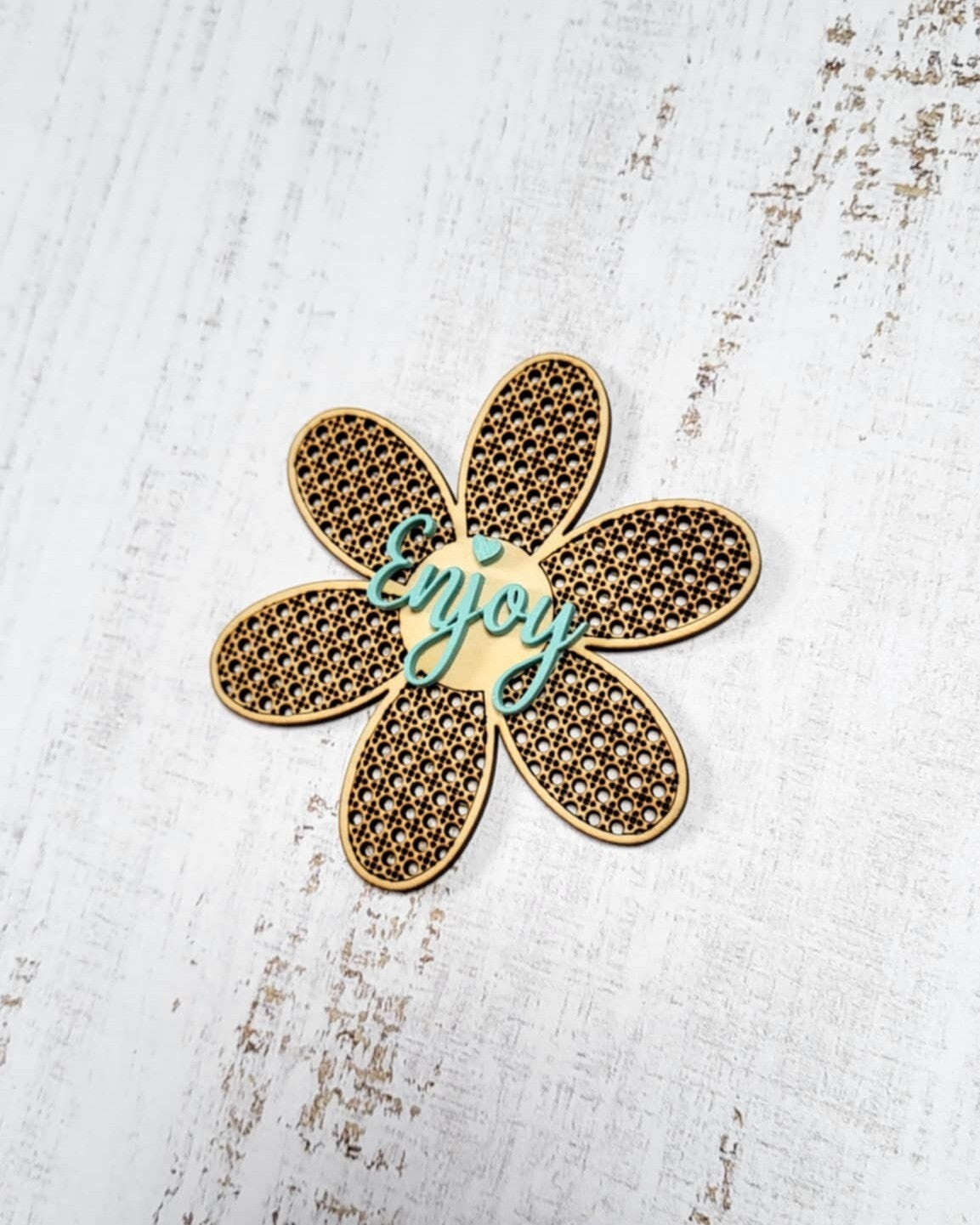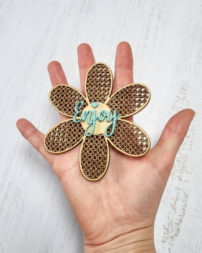 Une fleur en bois immitation rotin rehaussée d’un mot doux en bois peint par mes soins, pour une décoration encore plus unique.